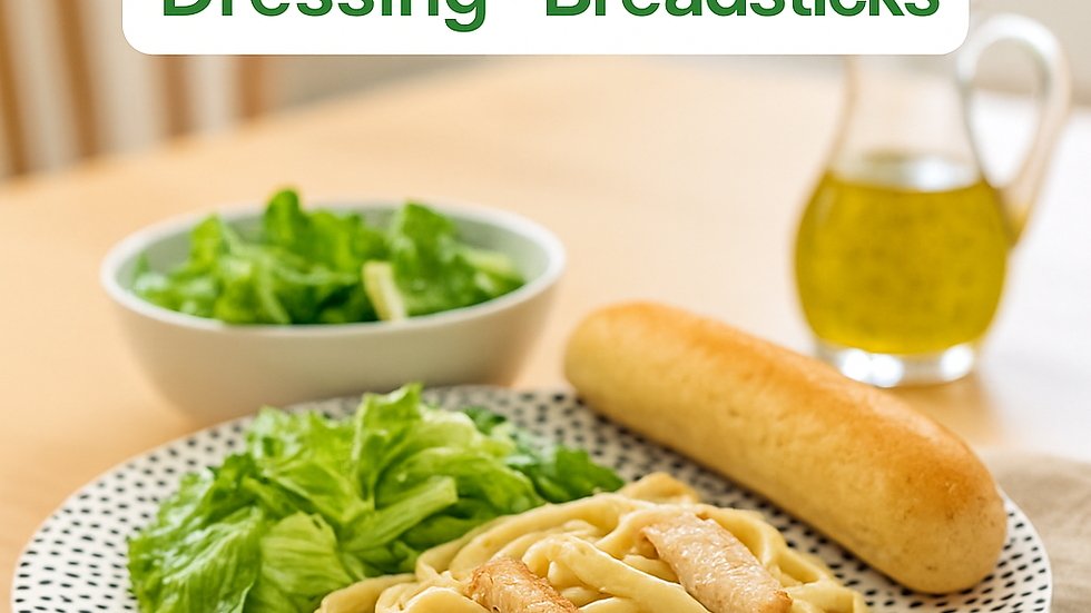 Includes: Alfredo Pasta, Italian Salad Dressing, Homemade Breadsticks